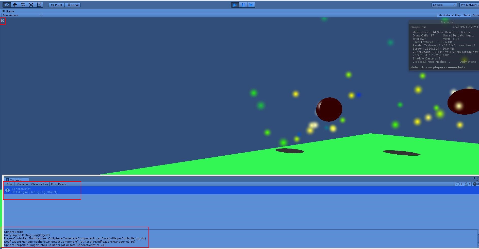 - Physically ‘collect’ sphere objects and see the players score increment by 10 points (proving that the OnSphereCollected event is being handled).