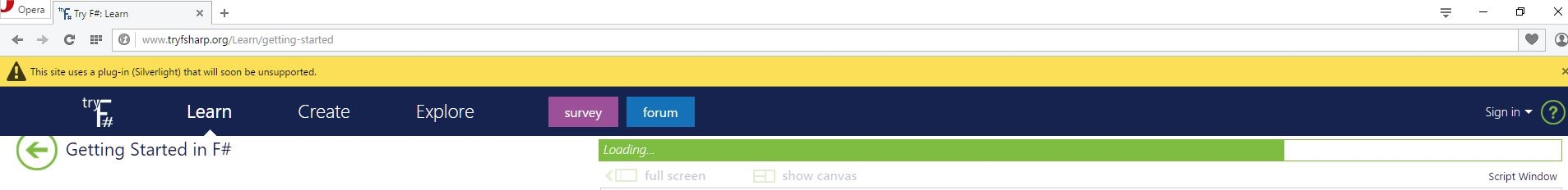 When using the tryfsharp.org site, the first hurdle that you’ll have to jump is compatibility issues with the Silverlight plugin used to drive the web editor. During my testing I had issues in Chrome and Edge, as outlined below: