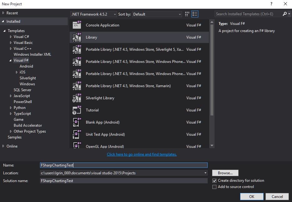 As per any other project you can simply navigate to File > New > Project and select the Visual F# templates. You’ve got options for creating Console Applications, Portable Libraries, Unit Test Applications, etc. From what I’ve seen, the Tutorial project is actually well worth a look, this can be used in conjunction with the tryfsharp website to grease the wheels if needed! For this project, the normal F# Class Library will suffice: