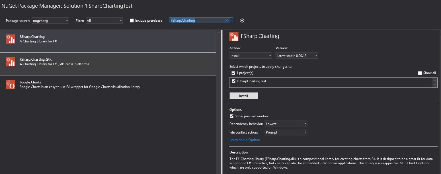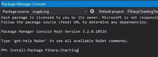 We next have to ‘NuGet it up’ and bring some extra resources into scope. This can be done using the Tools > NuGet Package Manager > Manage NuGet Packages for Solution option and then searching for FSharp.Charting, followed by clicking install (see image below), or more simply via the Package Manager Console found under Tools > NuGet Package Manager > Package Manager Console and use the command ‘Install-Package FSharp.Charting’: