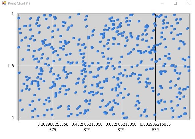 //Declare and bind another 'random' let anotherRandomValue = new Random() //Create a basic point chart using the simpler |> syntax (denoting we are calling the basic Chart.Point constructor with no frills) [for i in 0..500 -> anotherRandomValue.NextDouble(), anotherRandomValue.NextDouble()] |> Chart.Point