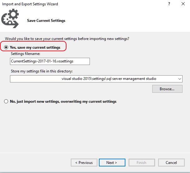 Next up, you can save your current settings to a .vssettings file, if you choose. This is a pretty solid bet if you have imported a new theme and have made customisations to it yourself, as you will want an easy way to rollback should your eyes be offended by whatever you import next 😉 ! If you like living on the edge there is always the ‘No, just import new settings, overwriting my current settings’ option. Pick the option that makes you feel good, then click Next: