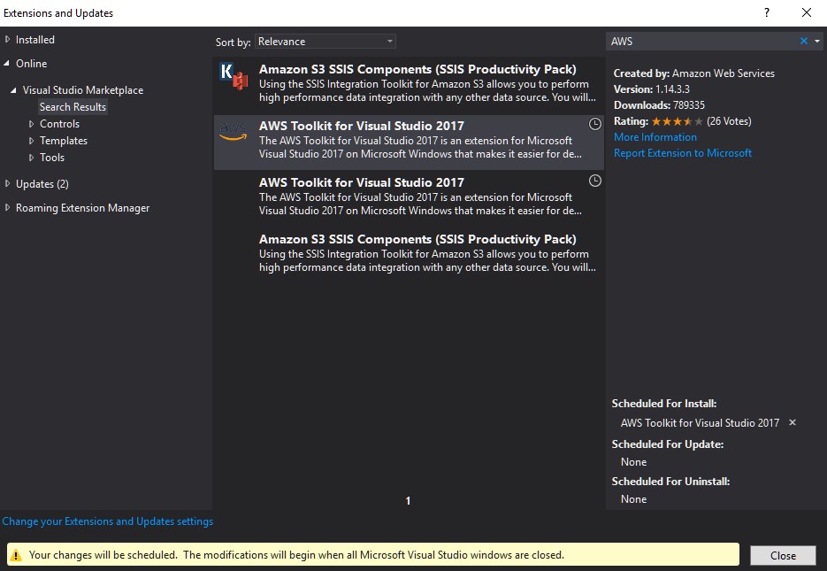 I’ve been bringing my poor, ageing laptop at home up to date. I’ve installed Visual Studio Community Edition 2017 and will look to get it ‘Lambda creation’ ready in short order. To get all of the lovely, sugar-coated, AWS support within Visual Studio (including access to an easy method of publishing Lambdas) I’m going to grab the AWS Toolkit for Visual Studio 2017. Navigate to Tools > Extensions and Updates > Online > Search for ‘AWS’ > This should bring back the AWS Toolkit for Visual Studio 2017. Go ahead and install this if you don’t already have it (closing Visual Studio to trigger the installation):