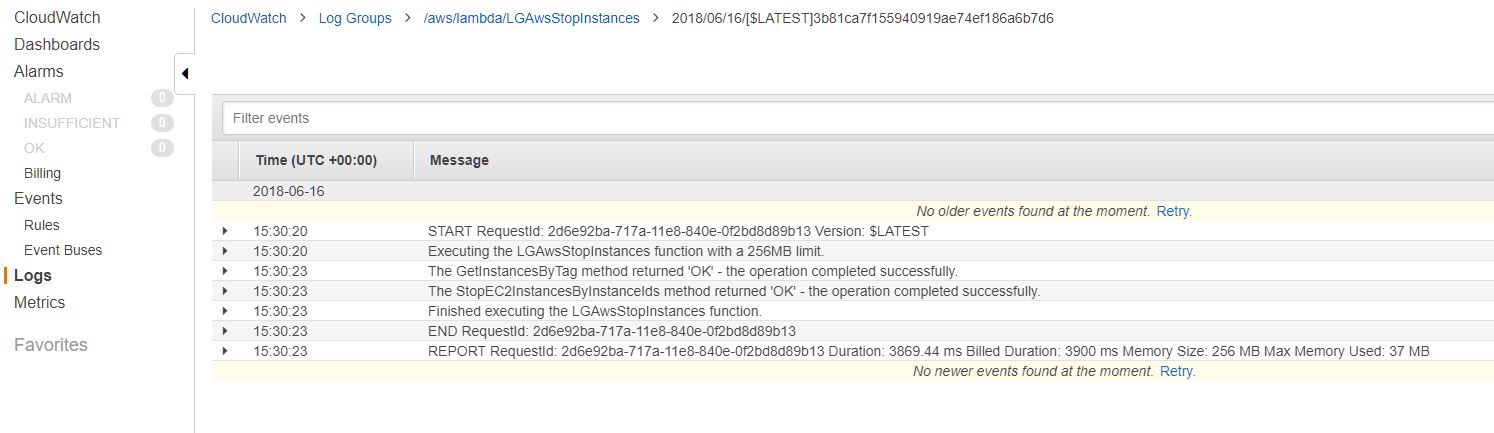 After proving this operation works correctly I opted to disable the event rule tied to this Lambda and created another event, mirroring the setup process already listed above, to prove the ‘LGAwsStopInstances’ function correctly triggers as expected: