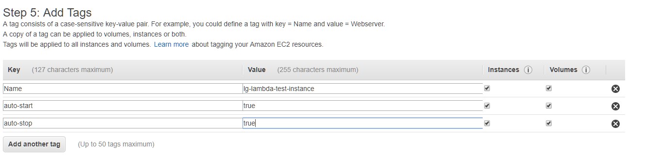 - Add Tags > We’ll add three here. Add a ‘Name’, ‘auto-start’ and ‘auto-stop’ tag as shown in the screenshot below.
