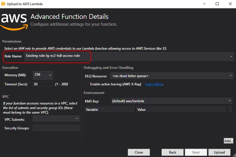 Here, in my case at least, I ensure that the recently created ‘lg-ec2-full-access-role’ role is selected – be sure to select an appropriate value and then click ‘Upload’ to complete the process. I’ve then, at this point, performed the same steps for the other Lambda function project. With any luck, the upload will be error-free and, on completion, we’ll be able to go back to the AWS Console and create our test EC2 instance. You’ll notice that Visual Studio also (there is a settings flag that governs this on the upload progress modal) loads a ‘test’ screen for you to trigger your function with. Lambdas are also testable within the AWS Console itself.