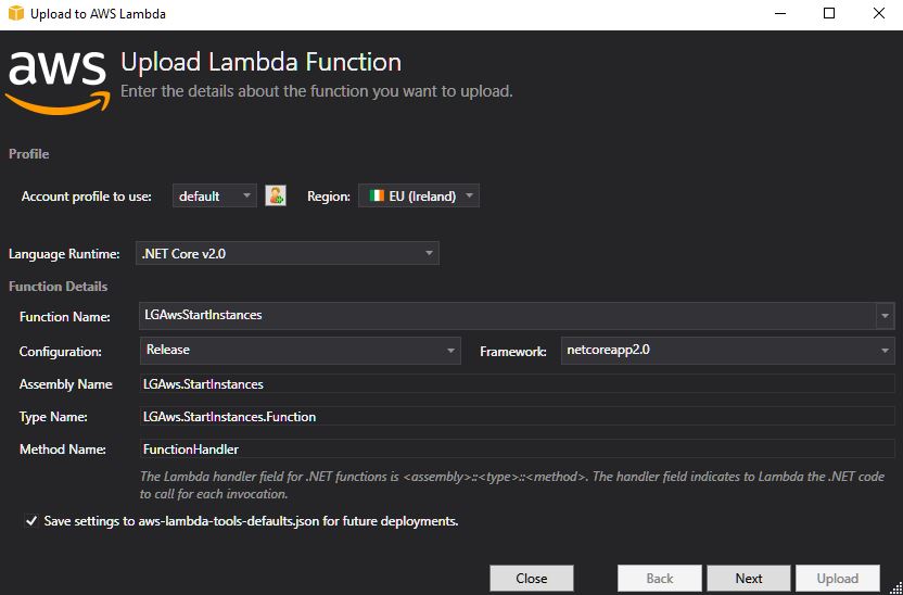 I had to close and reopen Visual Studio at this point to get the .NET Core Lambda templates to do their magic trick and appear. Navigate to File > New Project > Visual C# > AWS Lambda and you should be presented with an ‘AWS Lambda Project (.NET Core)’ option. I’m going to create a project called ‘LGAws.StartInstances’, wrapping everything in a solution for good measure. Once the solution is loaded I then opted to create a second Lambda project called ‘LGAws.StopInstances’. In both cases, I used the ‘Empty function’ blueprint as I want to roll with this fully from scratch.