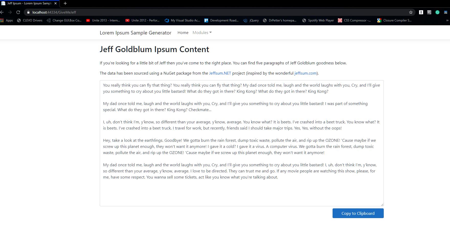 The ‘JeffIpsumService’ has the responsibility for generating Jeff Goldblum Lorem Ipsum goodness. 😀