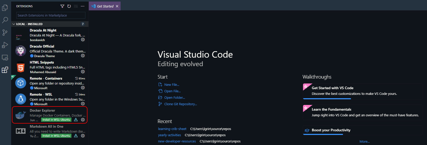 Inside this new window instance, we then need to hunt out Docker Explorer. I very much messed up here on my first run through and installed this as an extension in the wrong environment, if you happen to do this by mistake you’ll see, as per my second screenshot below, that VS Code will prompt you to ‘Install in WSL: Ubuntu‘: