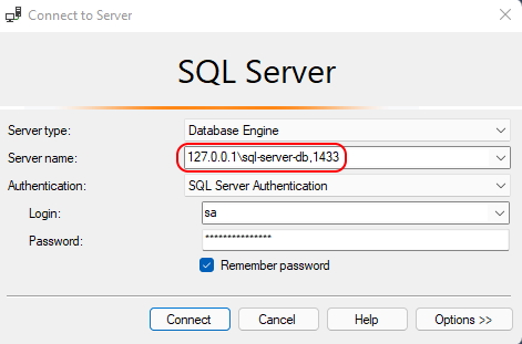 With this in hand, pop on over to SSMS and adjust the ‘Server name‘ using the following convention, ensuring you use the ‘sa‘ password you specified in your ‘docker-compose.yml‘ file during setup (the port should be ‘1433‘):