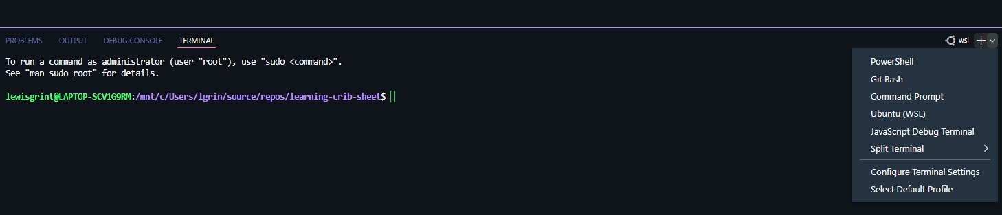 With the installation complete, I noted that VS Code added a Ubuntu (WSL) option for use when creating new terminal windows, nice!