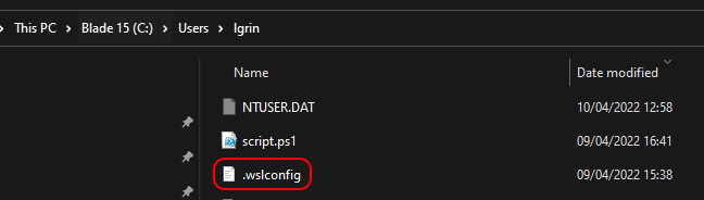 Back over in Windows, in my user profile directory, I then added the ‘.wslconfig‘ file with the following goodies in tow: